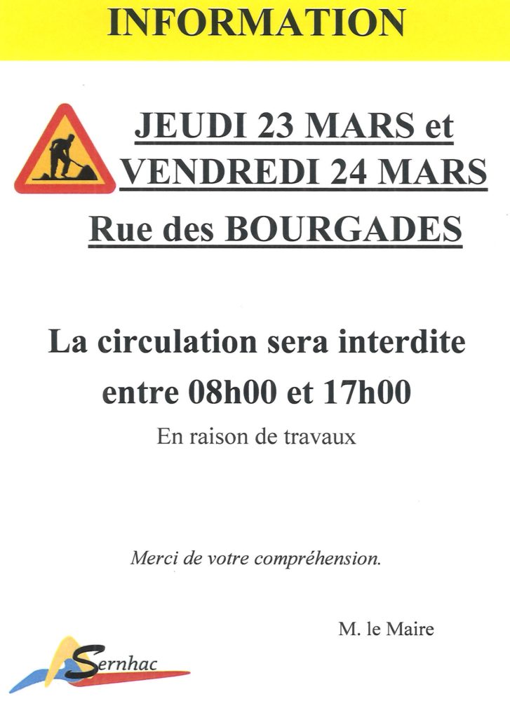 đźš§ Circulation et stationnement rue des BOURGADES : travaux jeudi 22 mars et vendredi 23 mars 2023