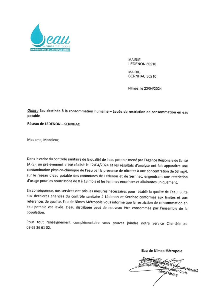 Eau de Nîmes Métropole vous informe que les derniers résultats d’analyse (contrôle réglementaire ARS) des deux prélèvements eau potable réalisés le 18/04/2024 en réseau de distribution à Sernhac et à Lédenon sont conformes aux limites et aux références de qualité imposées par le code de la santé.