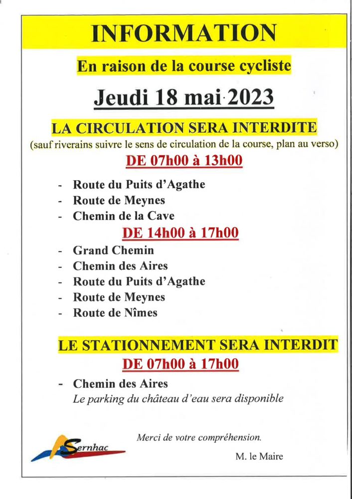 Arrêtés municipaux Catégorie : Actualités3 mai 2023Navigation articlePrécédent Article précédent :🚴🚴♀️Course cycliste le Grand Prix SernhacoisSuivantArticle suivant :Information TANGO – les RDV de la TANGOmobile – Mai 2023Articles similairesInformation stationnement salle polyvalente samedi 6 & dimanche 7 décembre1 décembre 2025🚧 Circulation travaux D986L1 décembre 2025Passage des éboueurs pour présentation des calendriers 202613 novembre 2025Place disponible en miro-crèche les mercredis13 novembre 2025Avis de Consultation publique SNCF Rive droite du Rhône12 novembre 2025Enquête publique communale lieu-dit la Soubeyranne4 novembre 2025
