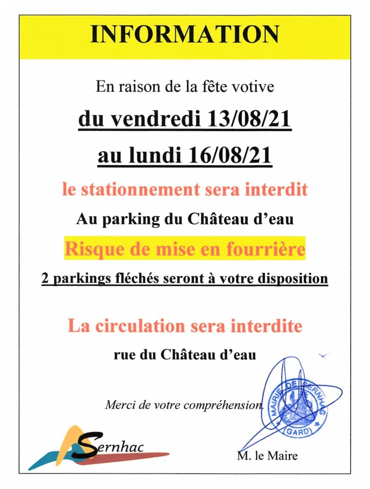 – Le stationnement des véhicules seront interdits : Parking du Château d’eau.