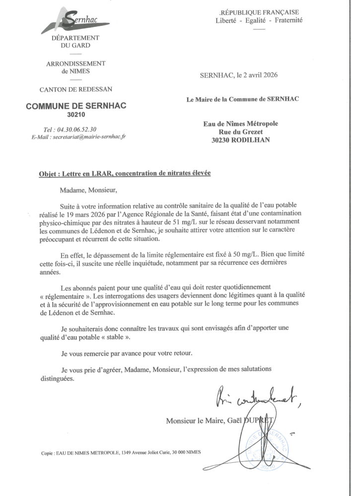 Catégorie : Actualités3 avril 2026Navigation articlePrécédent Article précédent :Collecte des ordures ménagères jour fériéArticles similairesCollecte des ordures ménagères jour férié2 avril 2026Dysfonctionnement réseau Orange route de Beaucaire2 avril 2026Coupure d’électricité2 avril 2026Mission argent de poche vacances PRINTEMPS 202630 mars 2026SERNHAC – LEDENON : Alerte nitrates – Restriction d’usage AEP – 26/03/202626 mars 2026SERNHAC – Eau potable – Baisses de pression25 mars 2026