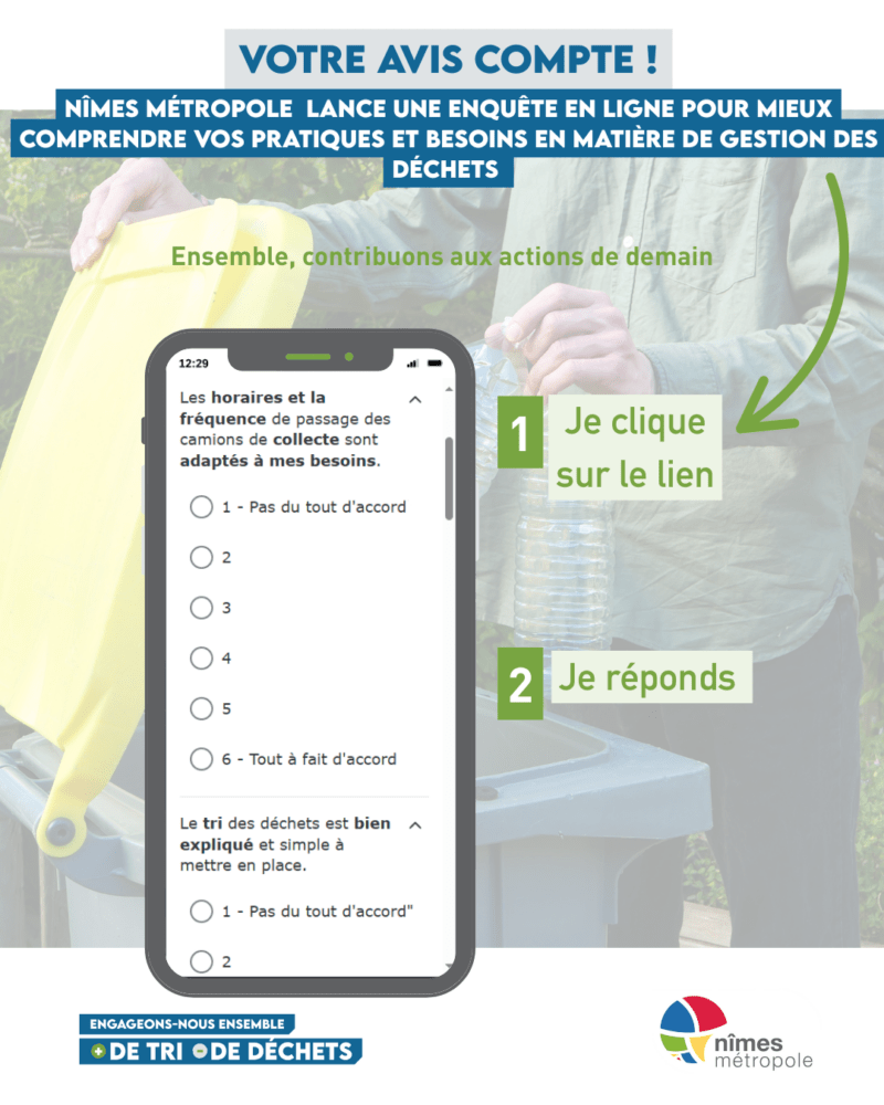« Nîmes Métropole souhaite mieux connaître vos habitudes et opinions concernant des pratiques telles que le tri, le réemploi, la réparation, ainsi que votre satisfaction vis-à-vis de la gestion des déchets.