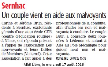 Carine et Jérôme Brun, gérants de l’auto-école CER Talabot à Nîmes et résidants de Sernhac, ont participé bénévolement à des journées de découverte ou redécouverte de la conduite organisées par l’association Les non voyants et leurs drôles de machines de Venterol (26) en faveur de personnes non et malvoyantes