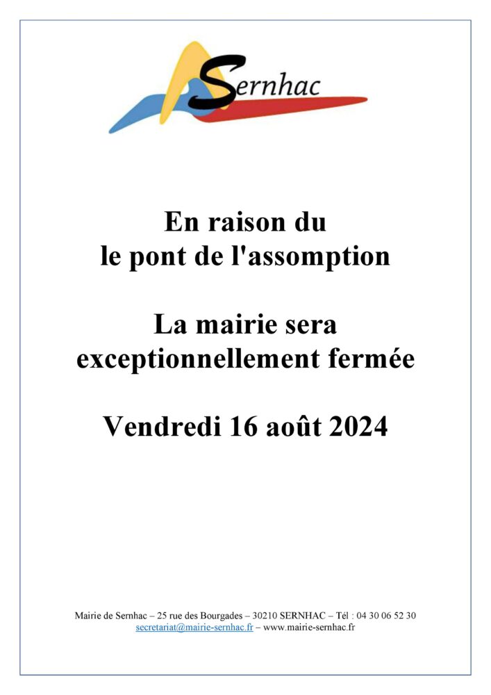 Catégorie : Actualités14 août 2024Navigation articlePrécédent Article précédent :OFFRE D’EMPLOI CDD agent techniqueSuivantArticle suivant :VIDE GRENIERArticles similairesInformation stationnement salle polyvalente samedi 6 & dimanche 7 décembre1 décembre 2025🚧 Circulation travaux D986L1 décembre 2025Passage des éboueurs pour présentation des calendriers 202613 novembre 2025Place disponible en miro-crèche les mercredis13 novembre 2025Avis de Consultation publique SNCF Rive droite du Rhône12 novembre 2025Enquête publique communale lieu-dit la Soubeyranne4 novembre 2025