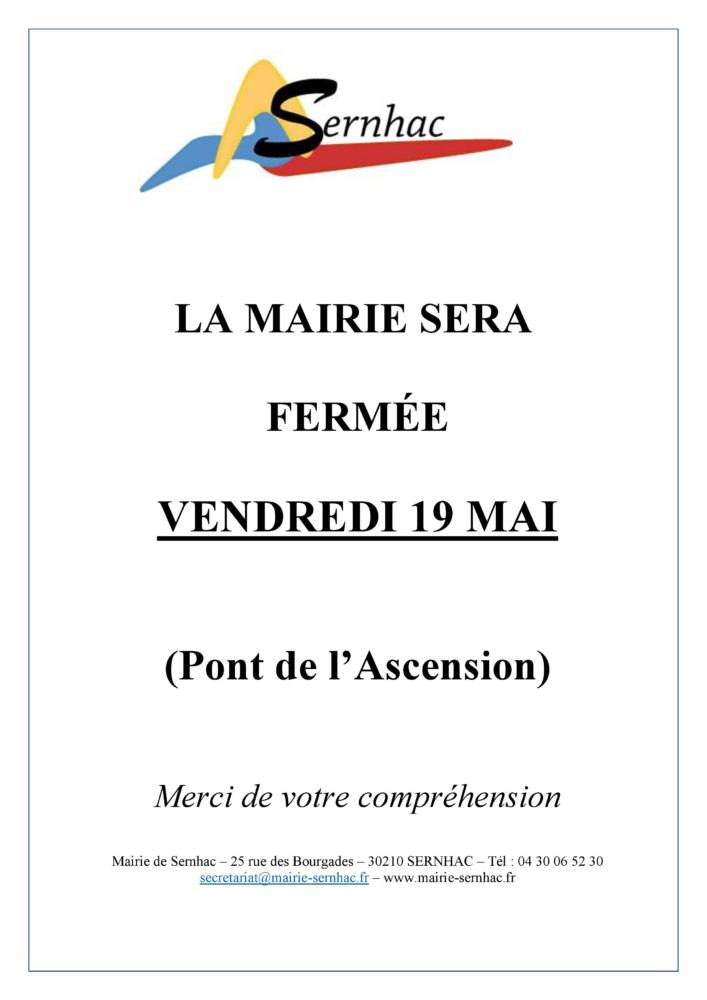 Catégorie : Actualités16 mai 2023Navigation articlePrécédent Article précédent :Information TANGO – Pont de l’AscensionSuivantArticle suivant :🧑🎨👩🎨🚵♀️🚵♂️🏃♀️C’est à partir de jeudi à Sernhac !Articles similairesInformation stationnement salle polyvalente samedi 6 & dimanche 7 décembre1 décembre 2025🚧 Circulation travaux D986L1 décembre 2025Passage des éboueurs pour présentation des calendriers 202613 novembre 2025Place disponible en miro-crèche les mercredis13 novembre 2025Avis de Consultation publique SNCF Rive droite du Rhône12 novembre 2025Enquête publique communale lieu-dit la Soubeyranne4 novembre 2025