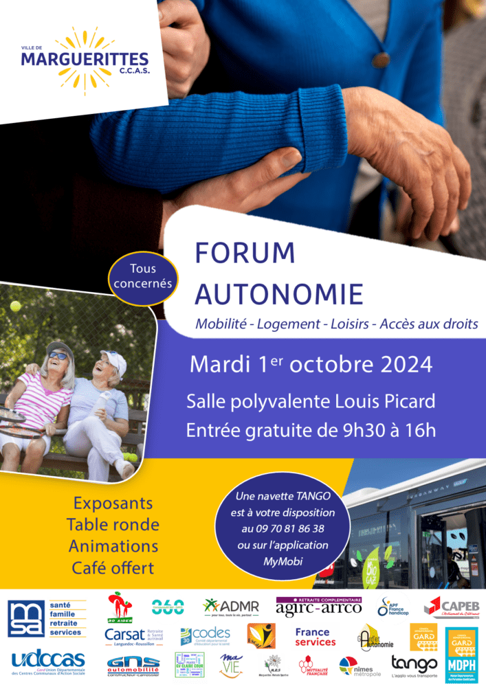 Forum autonomie MARDI 1er OCTOBRE de 9h30 à 16h – Salle Louis Picard Marguerittes Catégorie : Actualités19 septembre 2024Navigation articlePrécédent Article précédent :Conseil municipalSuivantArticle suivant :A la découverte de la pêcheArticles similairesInformation stationnement salle polyvalente samedi 6 & dimanche 7 décembre1 décembre 2025🚧 Circulation travaux D986L1 décembre 2025Passage des éboueurs pour présentation des calendriers 202613 novembre 2025Place disponible en miro-crèche les mercredis13 novembre 2025Avis de Consultation publique SNCF Rive droite du Rhône12 novembre 2025Enquête publique communale lieu-dit la Soubeyranne4 novembre 2025
