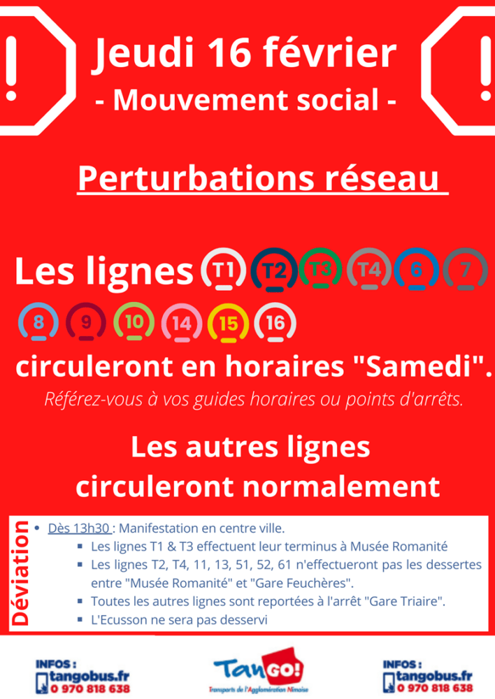 En raison d’un mouvement social national le jeudi 16 février 2023, les lignes du réseau TANGO – T1, T2, T3, T4, L6, L7, L8, L9, L10, L14, L15, L16 circulent en période « samedi ».
