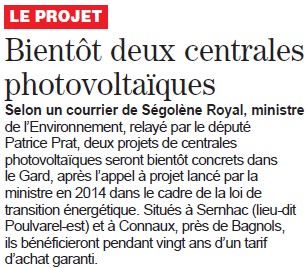 Le premier est situé au lieu-dit Poulvarel-est à Sernhac, et le second au lieu-dit Le Pontet et la Poujette à Connaux. Tous deux sont retenus « dans le cadre de l’appel d’offres que j’ai lancé en novembre 2014 afin d’appliquer rapidement la loi de transition énergétique, écrit la ministre. A ce titre, ces projets pourront bénéficier, pendant vingt ans à partir de leur réalisation, d’un tarif d’achat garanti. »