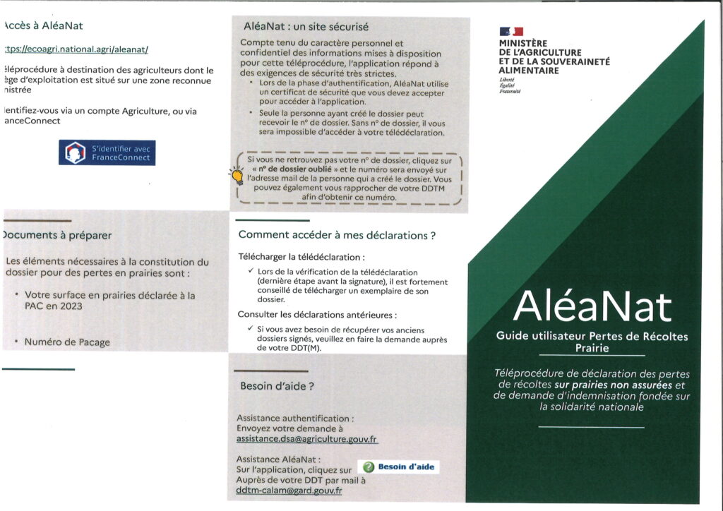 Cette reconnaissance porte sur les pertes de récoltes de prairies. Ce dispositif s’adresse aux agriculteurs dont les surfaces fourragères ne sont pas couvertes par une assurance multirisque climatique et qui déplorent une perte de récolte d’au moins 30% calculée sur l’ensemble de leur exploitation. Il doivent par ailleurs avoir déposé un dossier TELEPAC en 2023.Sur le site Les services de L’État dans le Gard, les agriculteurs de votre commune peuvent se renseigner sur ce nouveau dispositif :https://www.gard.gouv.fr/Actions-de-l-Etat/Agriculture/Aides-agricoles/Indemnite-de-Solidarite-nationale-ISN-assurance-recolte