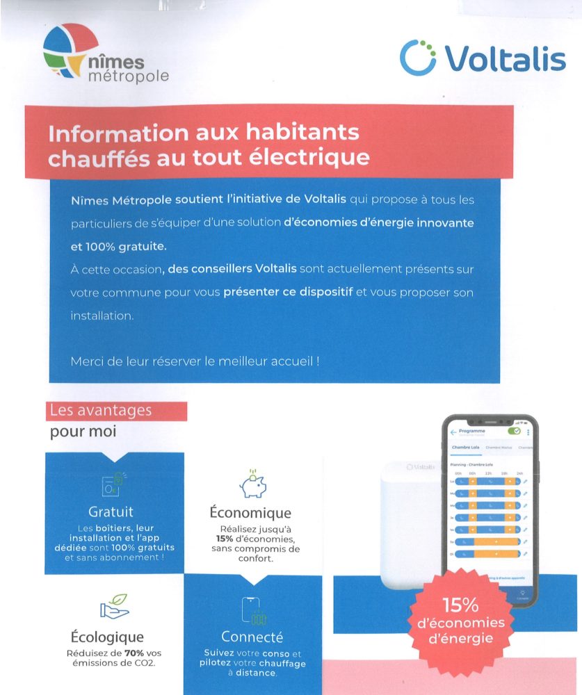 Vendredi 3 février 2023 – Nîmes Métropole. Réduire votre facture d’électricité ? C’est possible, facile et gratuit ! Première collectivité du Gard à s’engager dans cette démarche écocitoyenne, Nîmes Métropole a signé un partenariat avec Voltalis pour lancer une action concrète en faveur de la sobriété énergétique : l’installation de boitier dans les foyers chauffés à l’électricité, permettant de piloter intelligemment les radiateurs électriques. Propriétaires ou locataires, vous pouvez bénéficiez gratuitement de ce service innovant qui ne nécessite pas de travaux. A la clef, jusqu’à 15% d’économies d’électricité !