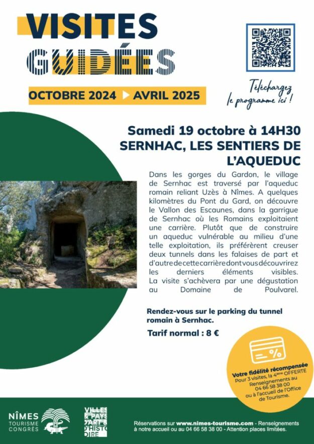 Samedi 19 octobre à 14H30 Rendez-vous sur le parking du VALLON Tarif normal : 8 € – Réservations sur www.nimes-tourisme.com – 04 66 58 38 00 – Attention places limitées
