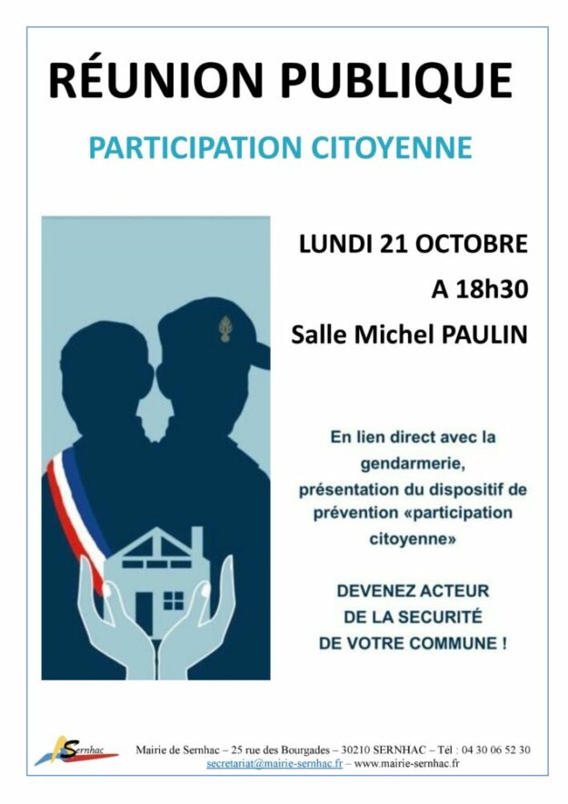 LUNDI 21 OCTOBRE à 18h30 Salle polyvalente Michel PAULIN En lien direct avec la gendarmerie, présentation du dispositif de prévention « participation citoyenne » DEVENEZ ACTEUR DE LA SECURITE DE VOTRE COMMUNE…