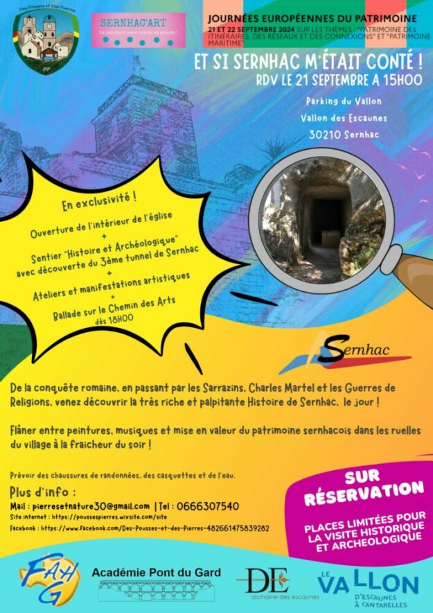SAMEDI 21 SEPTEMBRE à 15h – Ouverture de l’intérieur de l’église – Sentier « Histoire et archéologique » avec découverte du 3ème tunnel de Sernhac – Ateliers et manifestations artistiques – Balade…