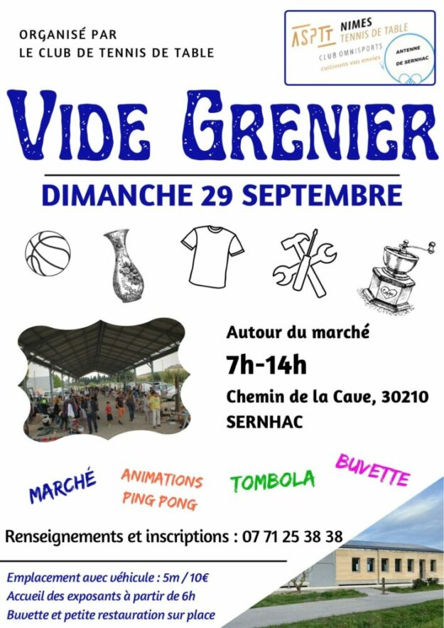 Vide grenier organisé par le Club de Tennis de Table DIMANCHE 29 SEPTEMBRE au marché couvert de 7h à 14h Renseignements et inscriptions : 07 71 25 38 38