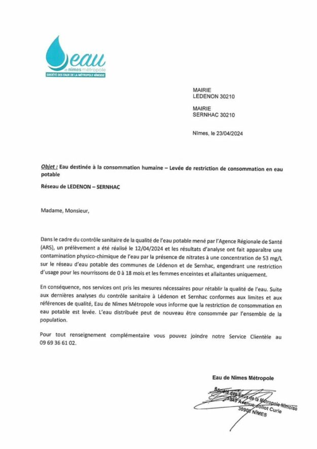 Eau de Nîmes Métropole vous informe que les derniers résultats d’analyse (contrôle réglementaire ARS) des deux prélèvements eau potable réalisés le 18/04/2024 en réseau de distribution à Sernhac et à…