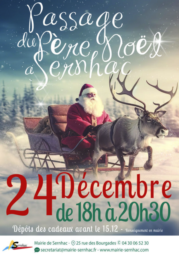 Bonne nouvelle ! Le père Noël sera de passage à Sernhac ! il passera en calèche le dimanche 24 décembre entre 18h et 20h30 pour donner les cadeaux à tous…