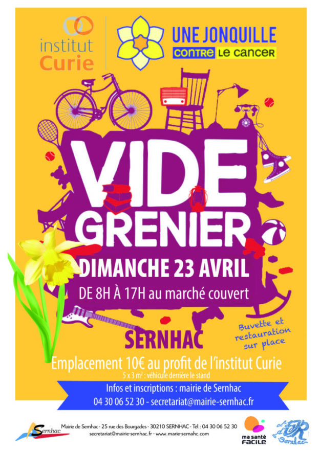 Vide grenier dimanche 23 avril à Sernhac Emplacement 10€ les 5x3M au profit de l’institut Curie Vide grenier : Organisé en collaboration avec Ma Santé Facile, le Club L’Age D’Or…