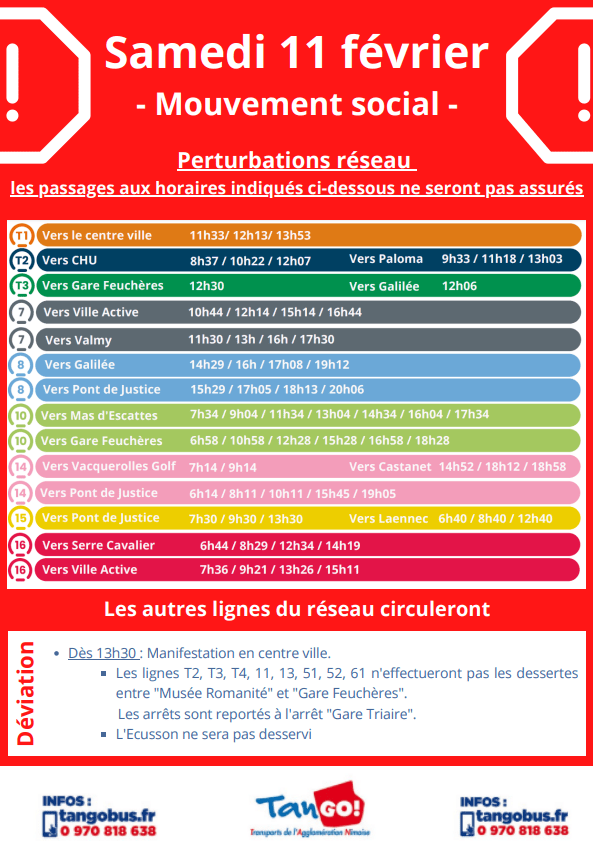 Information TANGO – Mouvement social national du samedi 11 février 2023 En raison d’un mouvement social national le samedi 11 février 2023, des perturbations sont à prévoir sur les lignes T1, T2,…
