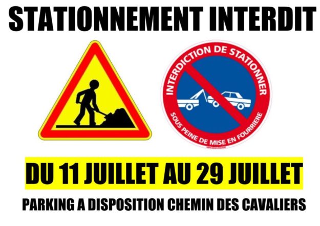 En raison de travaux sur le parking de la salle polyvalente Michel PAULIN, le stationnement sera interdit du 11 juillet au 29 juillet. Un parking sera à votre disposition chemin…