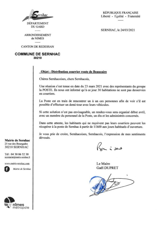 Lettre du Maire – Distribution du courrier route de Beaucaire