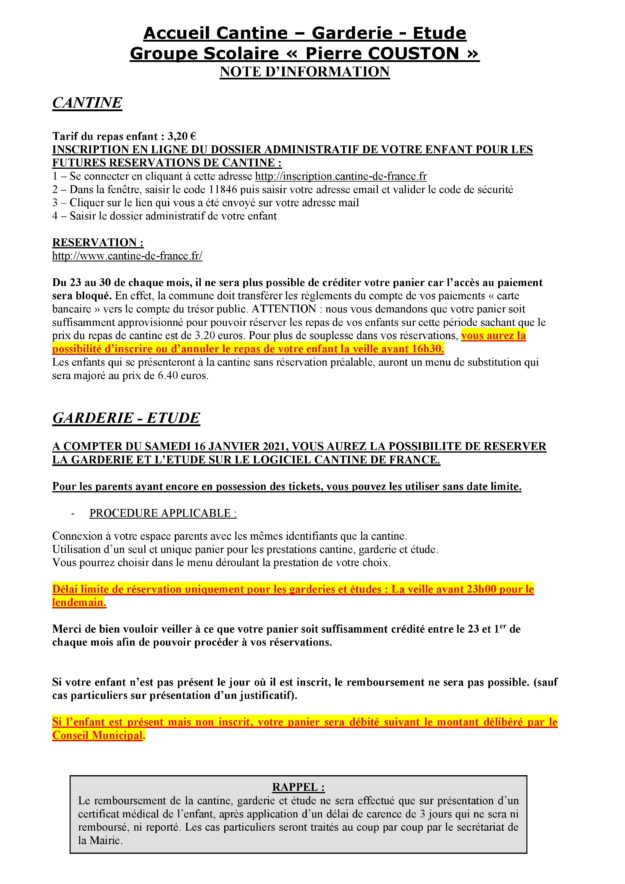 13 janvier – COMMUNICATION – Note d’information Cantine Garderie Etude