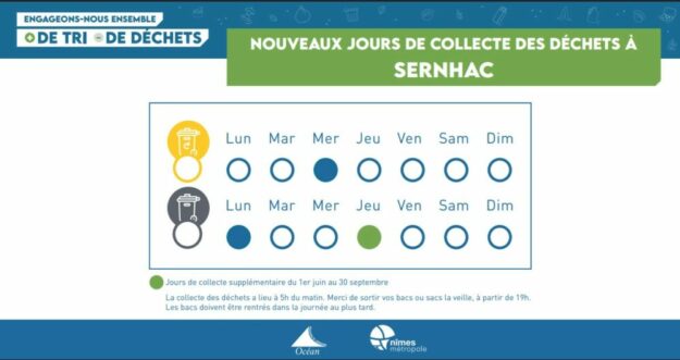 👉A partir du 📅1er juin et jusqu’au 30 septembre, la collecte des ordures ménagères s’effectuera sur 2 jours par semaine (le lundi et le jeudi)