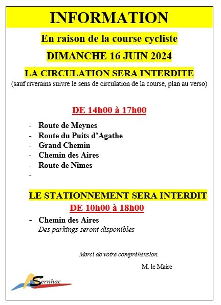 🚫Circulation dimanche 1er juin 🚴 Course cycliste le Grand Prix Sernhacois