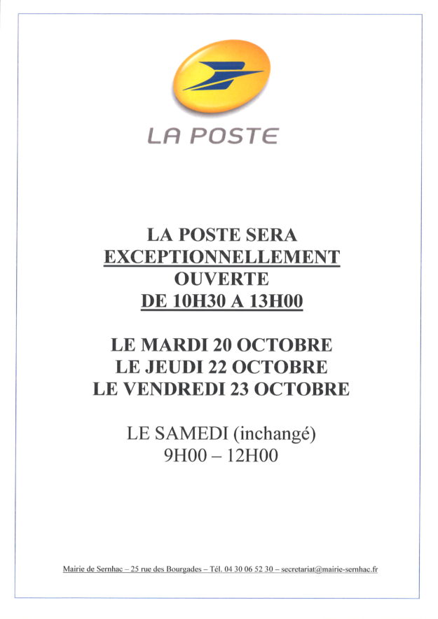 16 octobre– COMMUNICATION – Horaires de la poste semaine 43