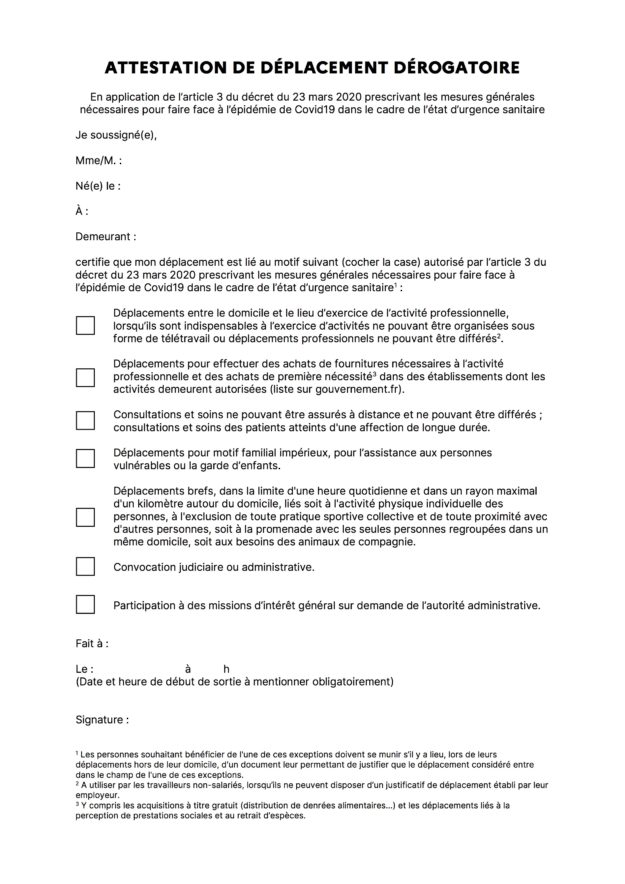 COVID 19 – Attestation de déplacement à partir du 23 mars