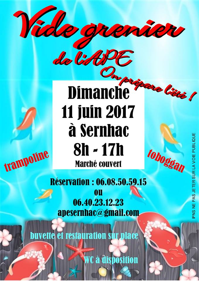 Réservation des emplacements (10 €) au 06.08.50.59.15, 06.40.23.12.23, ou apesernhac@gmail.com.