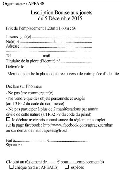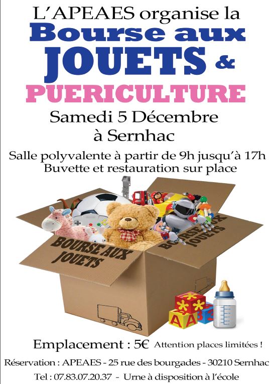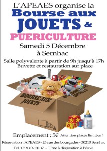 L’association des parents d’élèves et des amis de l’école de Sernhac – APEAES – organise ce samedi 5 décembre 2015 sa Bourse aux jouets et puériculture.