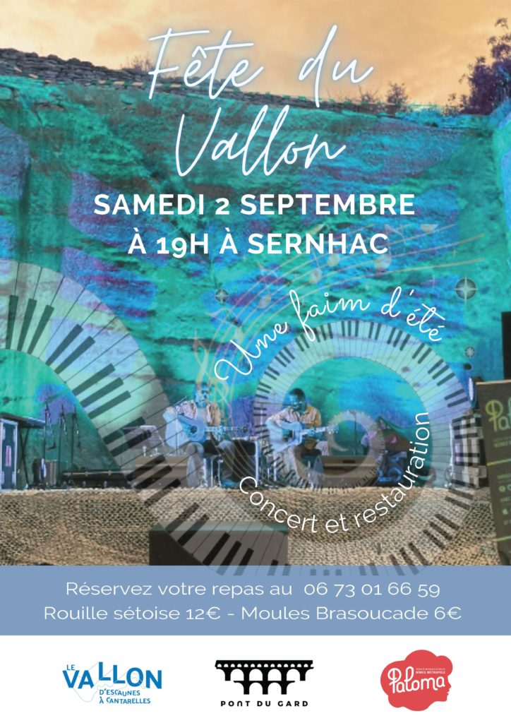 un événement en partenariat avec Paloma et le Site du Pont du GardL’ association « le Vallon d’Escaunes à Cantarelles » en partenariat avec le Site du Pont du Gard et Paloma, donne rendez-vous à tous les amoureux du patrimoine, pour sa traditionnelle fête du Vallon à Sernhac, le samedi 2 septembre autour « d’une faim d’été au Vallon ».