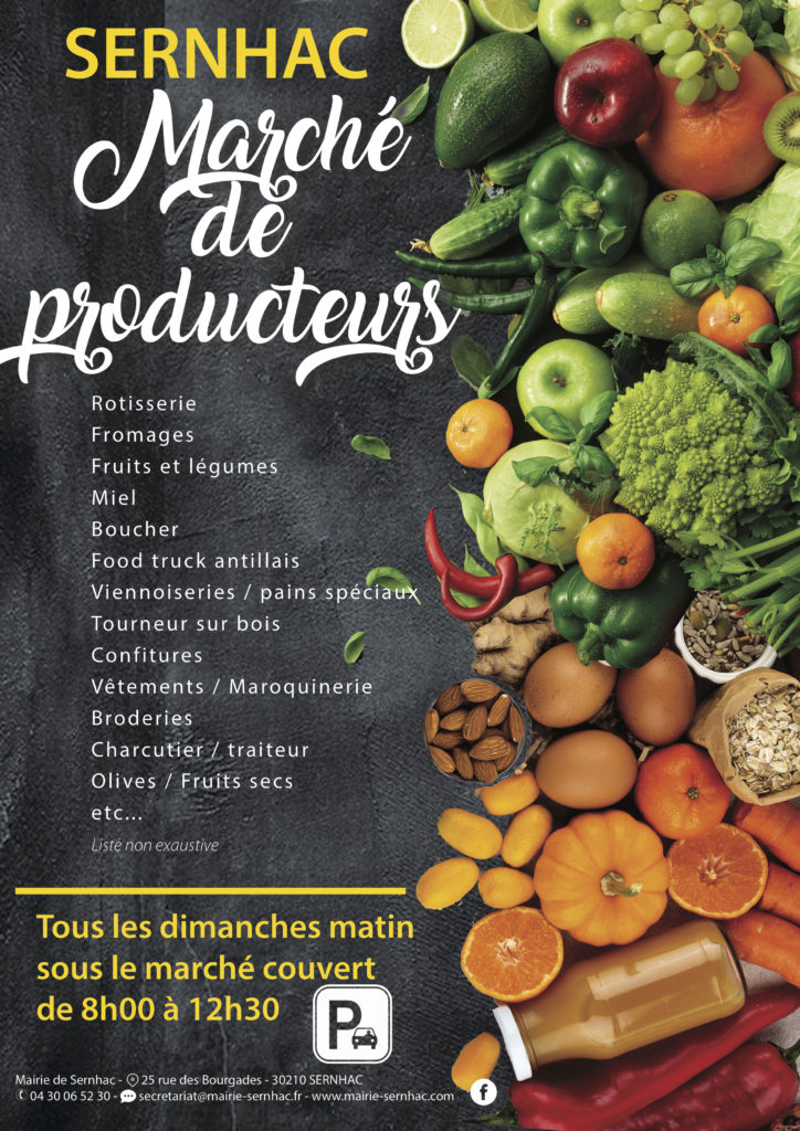 Marché hebdomadaire de Sernhac, tous les dimanches matin de 8h00 à 12h30 au marché couvert rue de la cave.