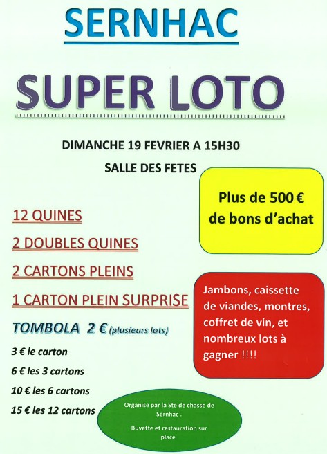SUPER LOTO organisé par LA SOCIÉTÉ DE CHASSE DE SERNHAC